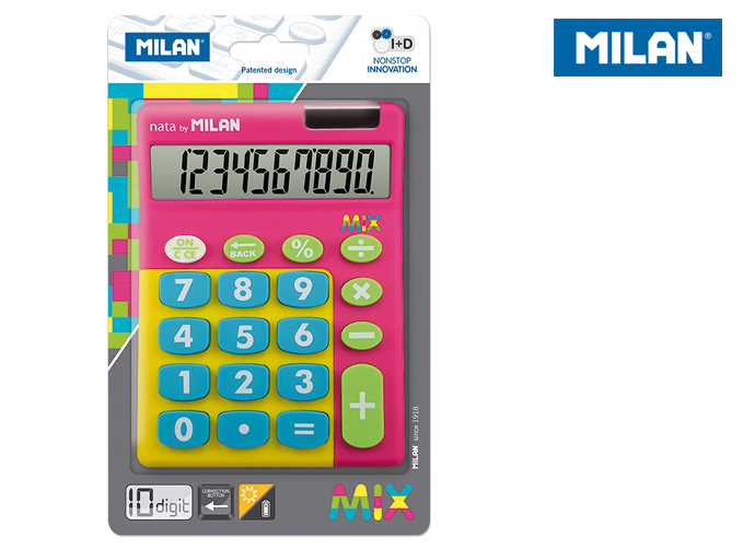 Kalkulator 10 pozycyjny z bardzo dużymi klawiszami, klawisz cofania ostatnio wpisanego znaku, plastikowe klawisze, podwójne zasilanie: bateria 1,5V oraz bateria słoneczna.
