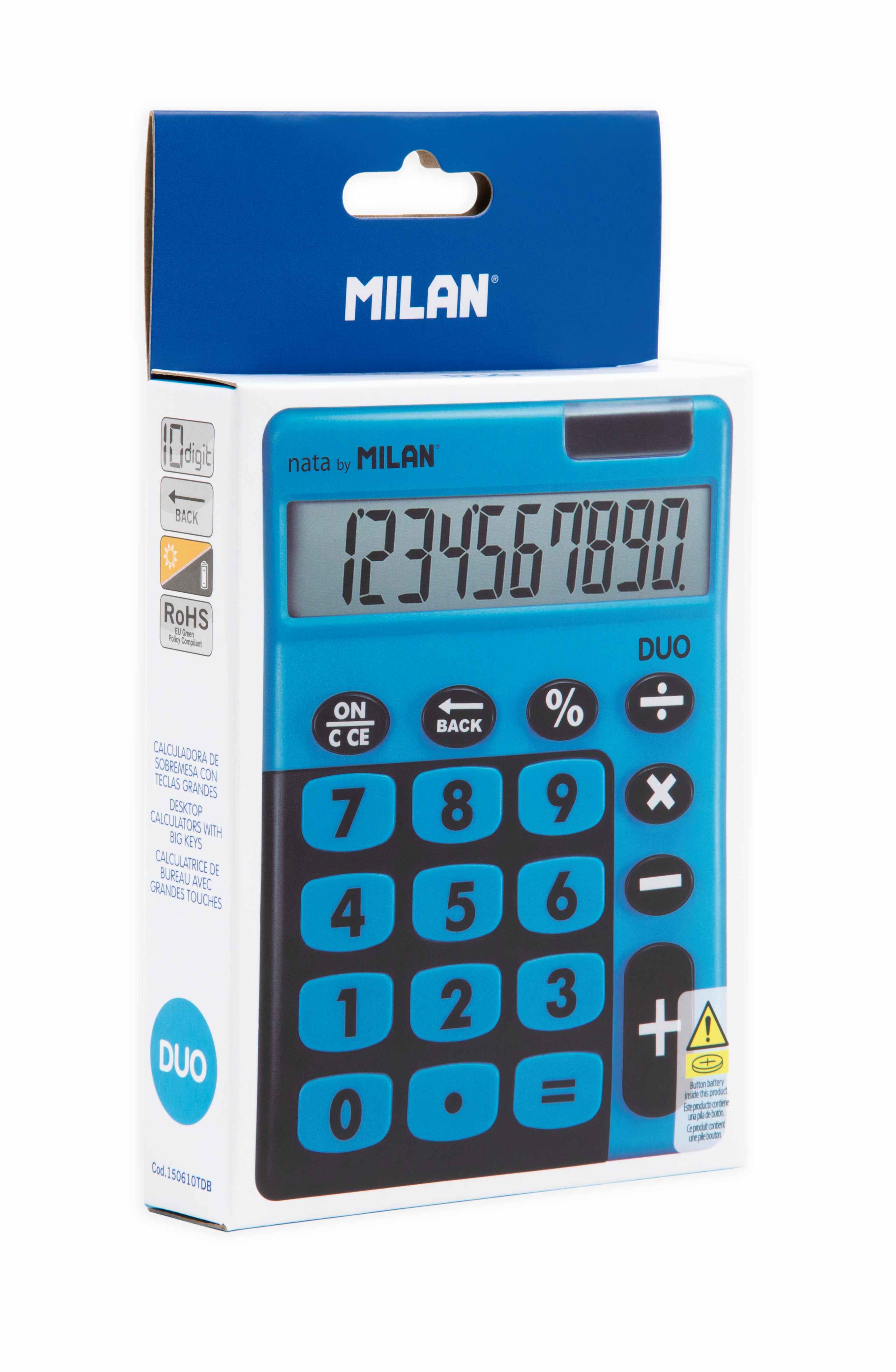Kalkulator 10-pozycyjny biurkowy z dużymi klawiszami i wyświetlaczem w kolorze niebiesko - czarnym. Wyraziste kolory kolekcji DUO podkreślają unikalny disign kalkulatora. Idealny dla osób starszych i słabowidzących. Klawisz korekty wprowadzanych danych. Podwójne zasilanie: bateria 1,5V oraz bateria słoneczna. Automatyczne wyłączanie. Kalkulatory spełniają wymagania dyrektywy RoHS o ograniczeniach stosowania niektórych substancji niebezpiecznych w urządzenia elektrycznych i elektronicznych. Oryginalny projekt stworzony przez własny dział badawczo-rozwojowy MILAN. Rozmiar kalkulatora: 14,5 x 10,6 x 2,1 cm. Pudełko kartonowe z zawieszką.