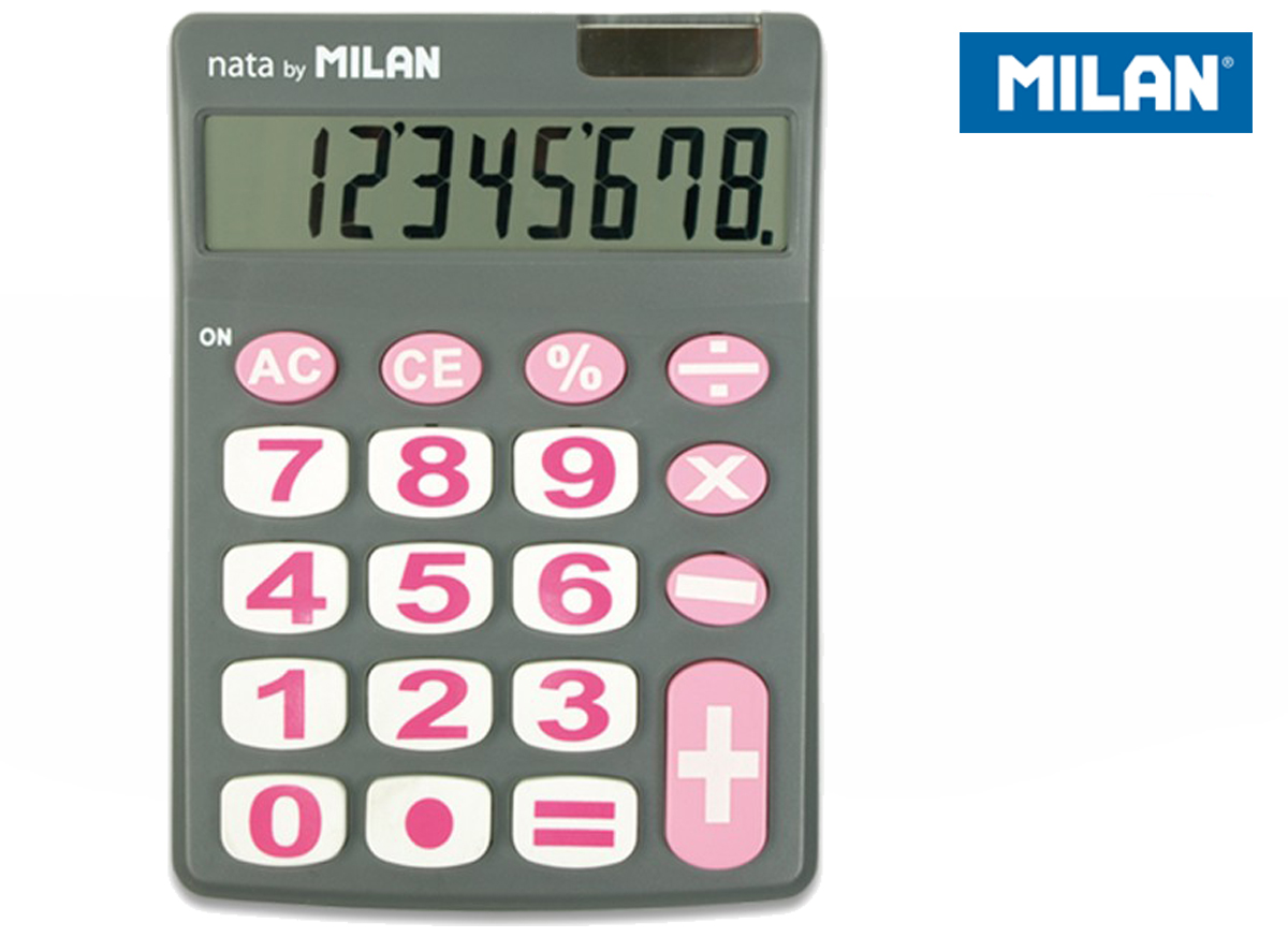 Kalkulator 8 pozycyjny z bardzo dużymi klawiszami, plastikowe klawisze, podwójne zasilanie: bateria 1,5V oraz bateria słoneczna. Idealny dla osób starszych i słabowidzących.