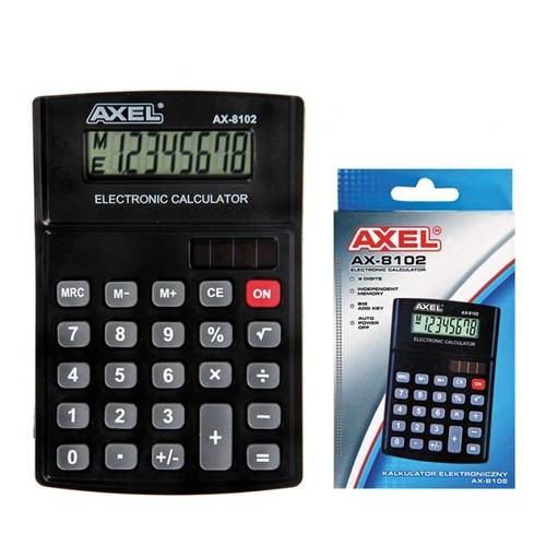 Elegancki kalkulator w obudowie z groszkowanego plastiku, z wyświetlaczem zamontowanym skośnie. Duże klawisze ułatwiają obsługę.