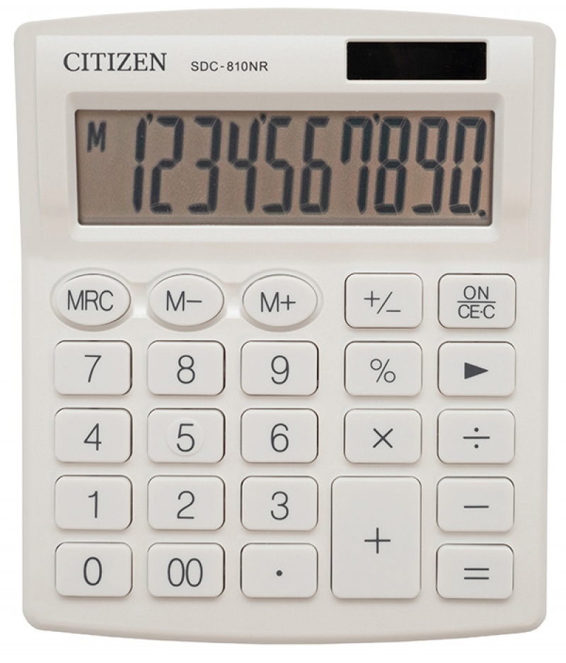 Model CITIZEN SDC-810NRWHE Kalkulator biurowy: 10-pozycyjny wyświetlacz, 3 przyciski pamięci: MRC, M+, M-, Zmiana znaku [+/-], Kasowanie ostatniej pozycji, Procenty [%], Podwójne zero [00], Podwójne zasilanie: bateria i bateria słoneczna.