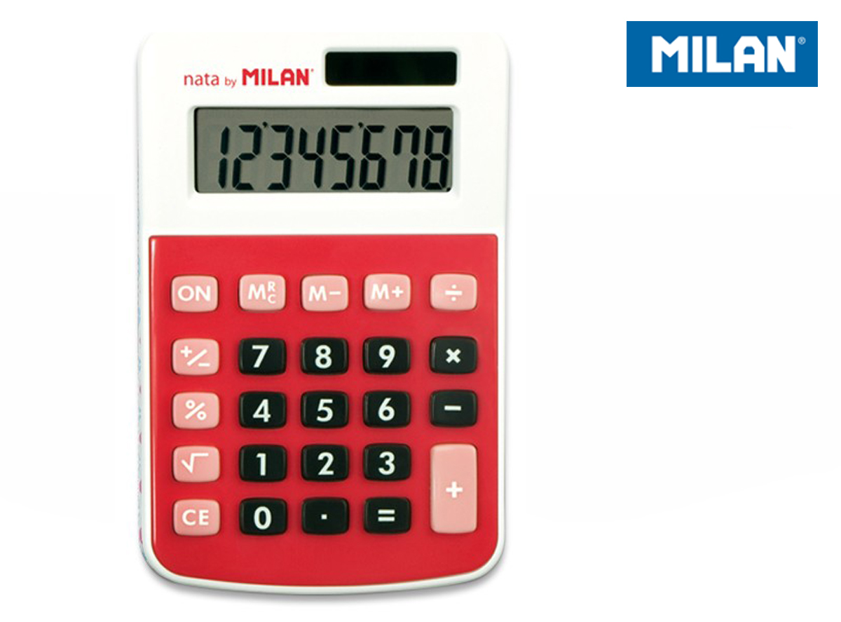 8 pozycyjny wyświetlacz, 3 klawisze pamięci, klawisz zmiany znaku +/-, plastikowe przyciski, podwójne zasilanie: bateria 1,5V oraz bateria słoneczna.