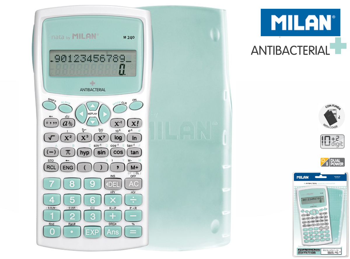 Kalkulator naukowy z antybakteryjną obudową, która pokryta jest powłoką zawierającą jony srebra, które hamują i zapobiegają rozwojowi bakterii w całym ciele. Idealne do poprawy higieny w szkole, w biurze, w środowiskach mających kontakt z żywnością i środowiskach sanitarnych. Posiada 240 zintegrowanych funkcji. 2 liniowy wyświetlacz LCD (10 + 2 cyfry). Równoczesne wyświetlanie wyrażenia matematycznego i wyniku. Biało-zielony kalkulator z wytrzymałym przezroczystym pokryciem ochronnym. Zasilanie: 2 x baterie AAA w zestawie. Zawiera instrukcje. Kalkulatory MILAN spełniają wymagania dyrektywy RoHS o ograniczeniach stosowania niektórych substancji niebezpiecznych w urządzenia elektrycznych i elektronicznych. Oryginalny projekt stworzony przez własny dział badawczo-rozwojowy MILAN. Pakowany na blistrze. Rozmiar kalkulatora: 16,7 x 8,4 x 1,9 cm. Najważniejsze dostępne funkcje: obliczenia statystyczne; rachunek 6 różnych rodzajów regresji wraz z ich współczynnikami A,B; wzajemna transformacja współrzędnych prostokątnych i biegunowych; bezpośrednie operacje na ułamkach, także sześćdziesiątkowych; funkcje trygonometryczne i odwrotne do trygonometrycznych; funkcje paraboliczne i hiperboliczne oraz im odwrotne; obliczenia z zastosowaniem jednostek kątowych w stopniach, radianach, gradach; konwersja między systemem dziesiętnym i sześćdziesiętnym; generowanie wartości losowych; obliczanie kombinacji i permutacji; notacja inżynierska; kursor do zmiany MENU; statystyka dwuwymiarowa z obliczaniem wartości średniej, szacowanej i sum; funkcje SCI/FIX/ENG.