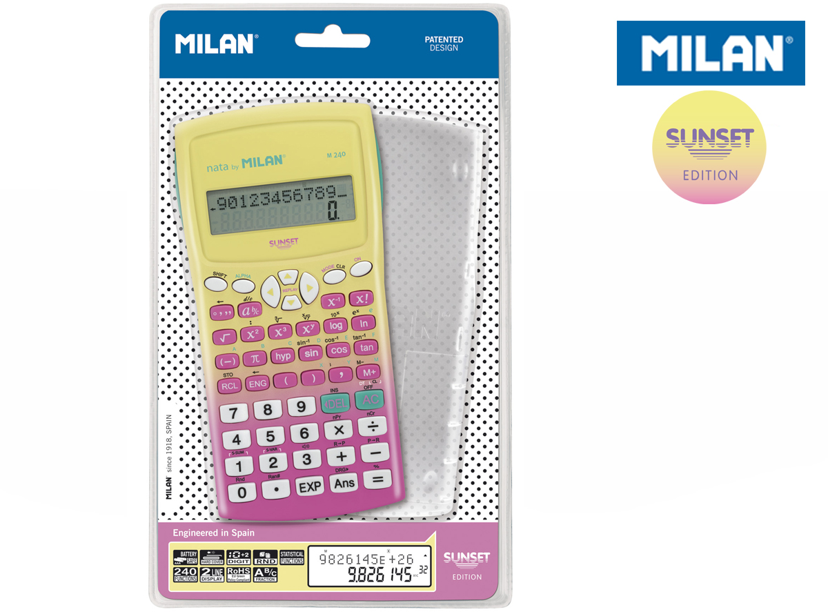 | Kalkulator naukowy z kolekcji SUNSET z 2 liniowym wyświetlaczem LCD (10 + 2 cyfry). Równoczesne wyświetlanie wyrażenia matematycznego i wyniku. Posiada 240 zintegrowanych funkcji. Żółto-różowy kalkulator z wytrzymałym przezroczystym pokryciem ochronnym. Zasilanie: 2 x baterie AAA w zestawie. Zawiera instrukcje. Kalkulatory MILAN spełniają wymagania dyrektywy RoHS o ograniczeniach stosowania niektórych substancji niebezpiecznych w urządzenia elektrycznych i elektronicznych. Oryginalny projekt stworzony przez własny dział badawczo-rozwojowy MILAN. Pakowany na blistrze. Rozmiar kalkulatora: 16,7 x 8,4 x 1,9 cm. Najważniejsze dostępne funkcje: obliczenia statystyczne; rachunek 6 różnych radzajów regresji wraz z ich współczynnikami A,B; wzajemna transformacja współrzędnych prostokątnych i biegunowych; bezpośrednie operacje na ułamkach, także sześćdziesiątkowych; funkcje trygonometryczne i odwrotne do trygonometrycznych; funkcje paraboliczne i hiperboliczne oraz im odwrotne; obliczenia z zastosowaniem jednostek kątowych w stopniach, radianach, gradach; konwersja między systemem dziesiętnym i sześćdziesiętnym; generowanie wartości losowych; obliczanie kombinacji i permutacji; notacja inżynierska; kursor do zmiany MENU; statystyka dwuwymiarowa z obliczaniem wartości średniej, szacowanej i sum; funkcje SCI/FIX/ENG. |