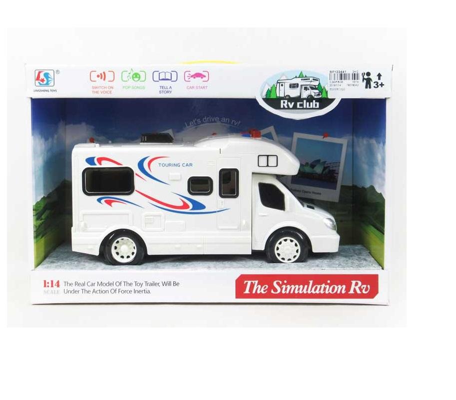 Duży biały kamper z funkcją światła oraz dźwięku.