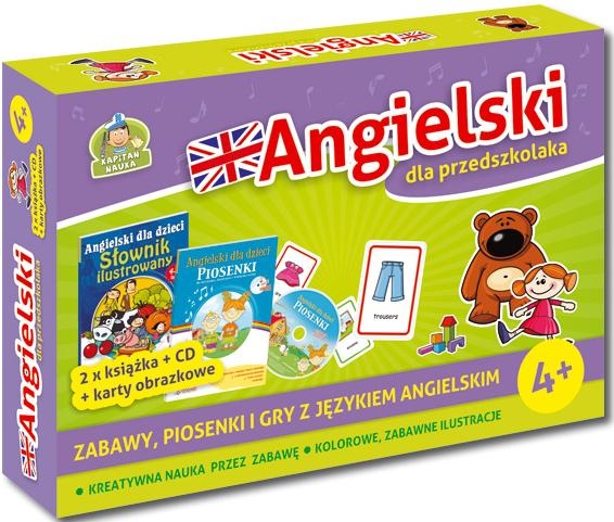 Pakiet Angielski dla przedszkolaka to zestaw edukacyjny dla najmłodszych, który zapewnia aktywną naukę języka poprzez gry, śpiew i zabawę. Składa się z książki i słownika, płyt CD, na których znajdują się piosenki w wykonaniu 7-letniej Brytyjki i nagrania lektorów. Dodatkowo zestaw zawiera komplet kolorowych kart obrazkowych do nauki słówek. Pakiet został specjalnie opracowany tak, aby dziecko podczas zabawy aktywnie uczyło się języka angielskiego, doskonaliło rozumienie ze słuchu oraz wymowę.W pakiecie znajdują się:Słownik- 150 słów starannie wybranych dla najmłodszych - zabawne ilustracje słówek- pełne tłumaczenie na język polskiPiosenki- książka + płyta CD- 14 melodyjnych utworów- teksty po polsku i angielsku- piosenki w wykonaniu małej BrytyjkiKarty obrazkowe- dwustronne, angielsko-polskie karty- nauka angielskiego poprzez gry i zabawę- kolorowe, śmieszne ilustracje