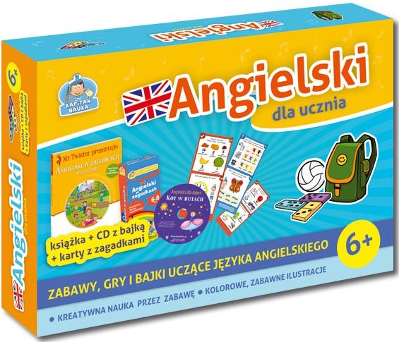 Pakiet Angielski dla ucznia to zestaw edukacyjny dla dzieci, który zapewnia aktywną naukę języka. Składa się z: książki z zagadkami, słuchowiska ""Kot w butach"" oraz zestawu kart obrazkowych z quizami i łamigłówkami. Pakiet został specjalnie opracowany tak, aby dziecko podczas zabawy aktywnie uczyło się języka angielskiego, doskonaliło rozumienie ze słuchu oraz wymowę. W pakiecie znajdują się: Mr Twister Angielski w zagadkach dla ucznia - 80 interesujących zagadek - rebusy, puzzle, historyjki obrazkowe - zabawne ilustracje i słowniczek Karty obrazkowe Angielski w zagadkach - 112 zagadek na dwustronnych kartach - wciągająca forma nauki poprzez quizy i łamigłówki - odpowiedzi na rewersie do natychmiastowego sprawdzenia Bajka na płycie CD ""Kot w butach"" - słuchowisko w języku angielskim i polskim - nauka angielskiego poprzez słuchanie - wciągająca historia, piękna muzyka i efekty dźwiękowe