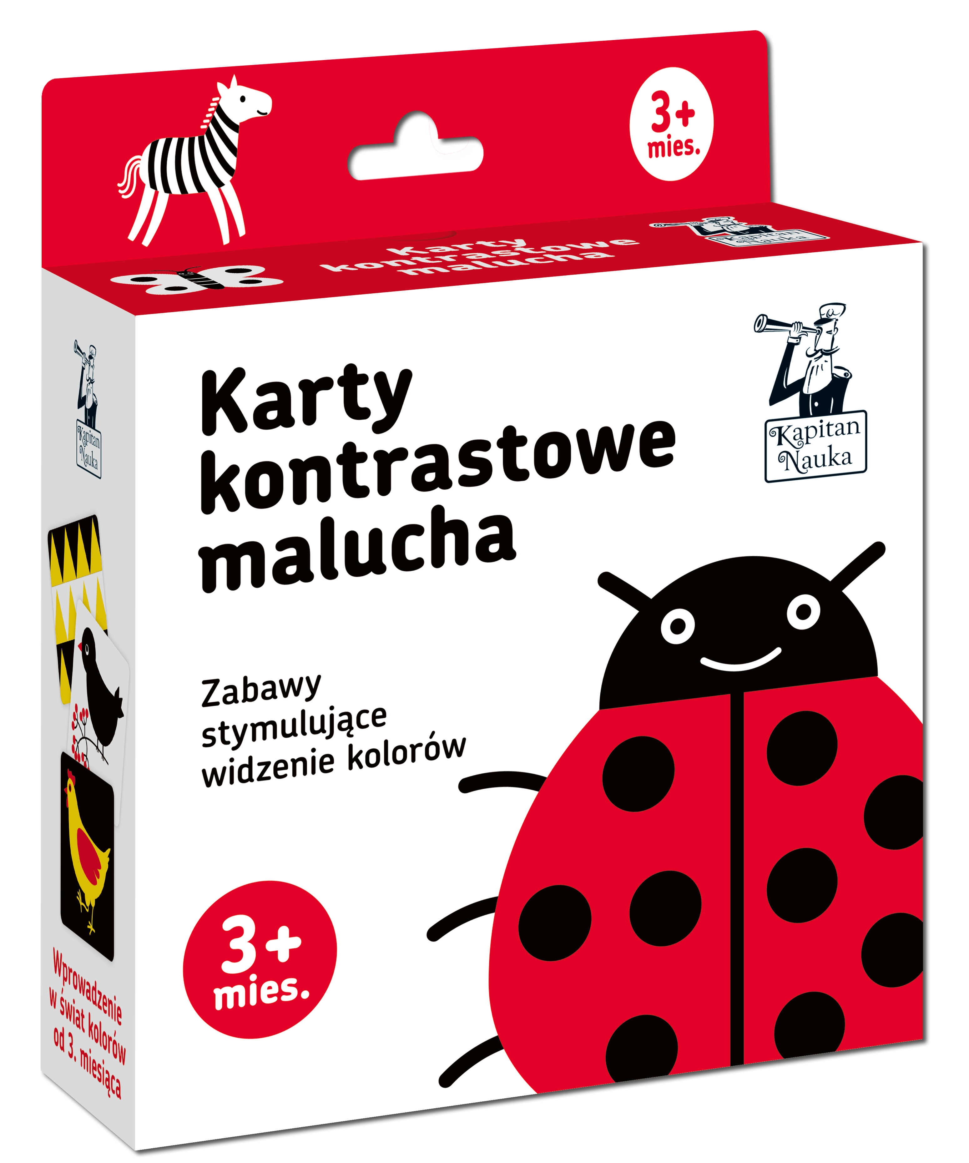 Karty kontrastowe malucha (3+ mies.) to drugi z serii kontrastowej zestaw zabaw stymulujących wzrok dzieci od 3. do 6. miesiąca życia. Zawiera 12 dużych, dwustronnych czarno-białych kart z pojedynczymi elementami w czterech barwach podstawowych: czerwonej, żółtej, zielonej i niebieskiej. Do pakietu dołączony jest również poradnik dla opiekunów ze wskazówkami terapeutki widzenia i optometrystki, jak rozwija się wzrok w pierwszym roku życia dziecka, oraz pomysłami na kreatywne zabawy z kartami, które można wykorzystywać na wiele sposobów, tak aby uczyć poznawania kształtów i kolorów, a jednocześnie budować niepowtarzalną więź z niemowlakiem.