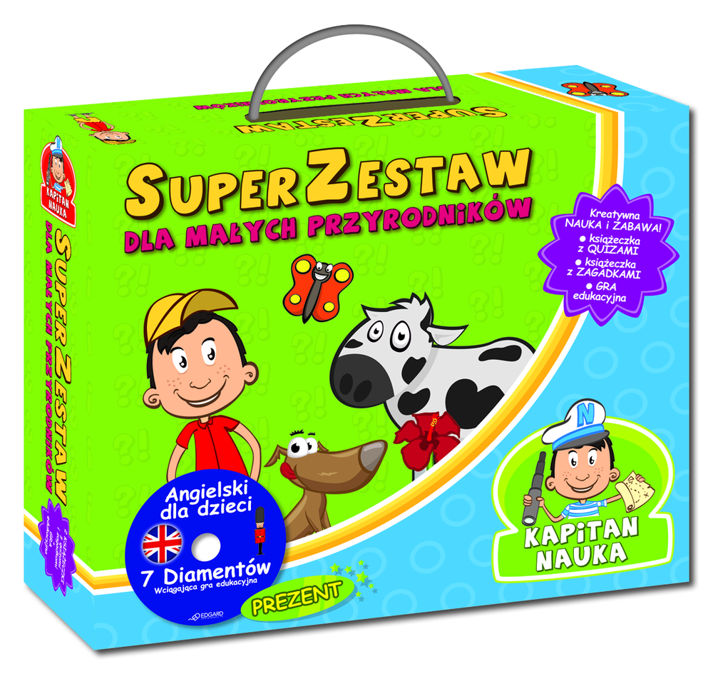 SuperZestaw dla małych przyrodników to unikalny edukacyjny pakiet, który zapewnia najmłodszym możliwość aktywnego odkrywania przyrody i zdobywania wiedzy o zwierzętach poprzez zabawę. Zestaw składa się z dwóch książeczek, które można zabrać na spacer lub w podróż – to doskonały pomysł na połączenie zabawy z edukacją! Dodatkowo do pakietu dołączono w prezencie płytę CD-ROM z wciągającą grą komputerową do nauki języka angielskiego.
