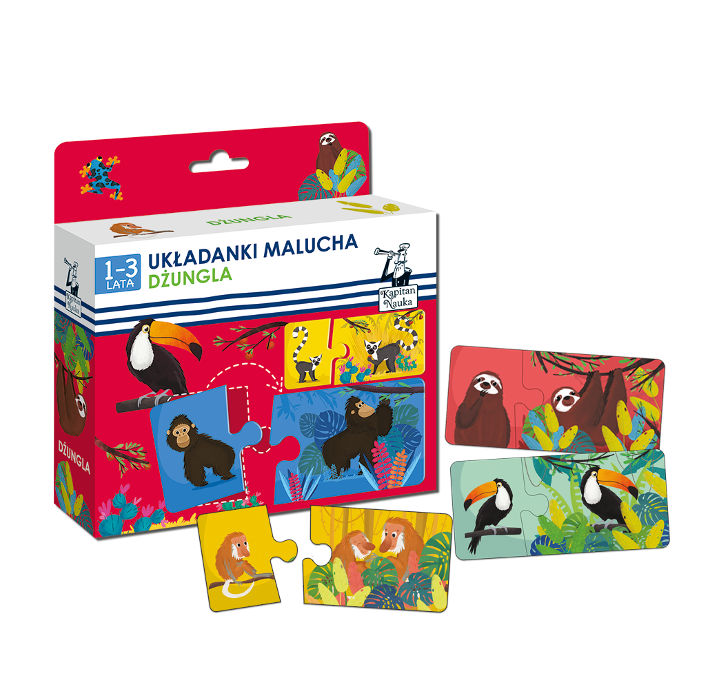 DŻUNGLA to wyjątkowa propozycja dla najmłodszych dzieci w wieku od roku do trzech lat. Piękne, dwuelementowe puzzle, narysowane przez Katarzynę Nowowiejską, to nie tylko wspaniała zabawa, ale także ćwiczenie koordynacji oko-ręka, spostrzegawczości i koncentracji.