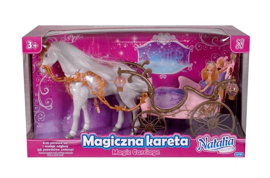 KOŃ PORUSZA SIĘ I WYDAJE ODGŁOSY JAK PRAWDZIWE ZWIERZĘ. KOŃ - 3 BATERII AA, KARETA 2 BATERII AA (BATERIE NIE NALEŻĄ DO ZESTAWU). BEZ LALKI. WYM. OPK.: 56 X 20 X 30 CM