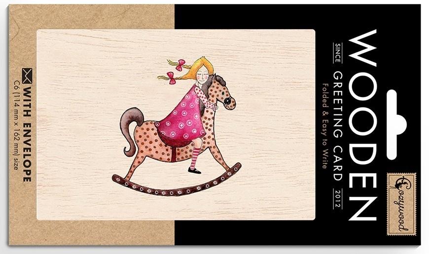 Opakowanie Karnet drewniany C6 + koperta Dziewczynka na koniku na biegunach