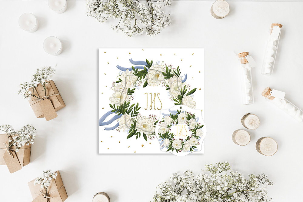 Składany z trzech stron kwadratowy karnet o wymiarach 15 x 15 cm z wyciętym elementem na froncie. Złocony i tłoczony, teksy życzeń w środku. Wydrukowany na wysokiej jakości papierze. W zestawie koperta.