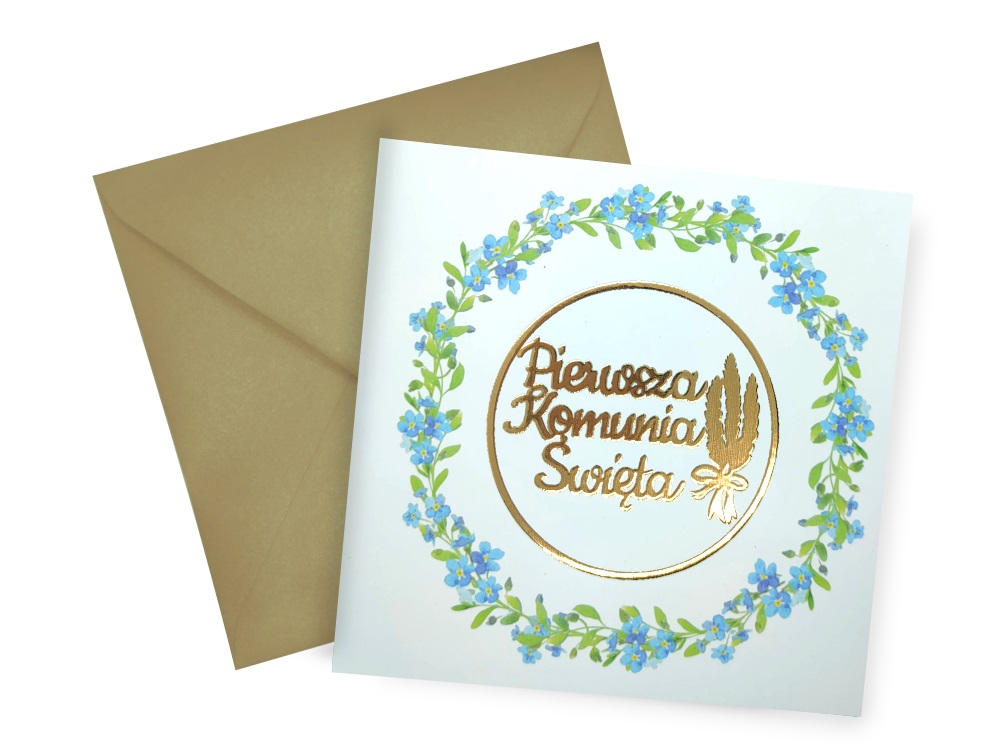 Karnet w formacie 15 x 15 cm. Wydrukowany na wysokiej jakości papierze. Uszlachetniony złotym metalicznym lakierem 3D. W zestawie perłowa koperta.