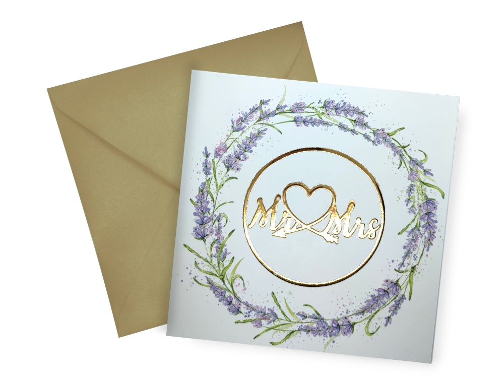 Karnet w formacie 15 x 15 cm. Wydrukowany na wysokiej jakości papierze. Uszlachetniony złotym metalicznym lakierem 3D. W zestawie perłowa koperta.