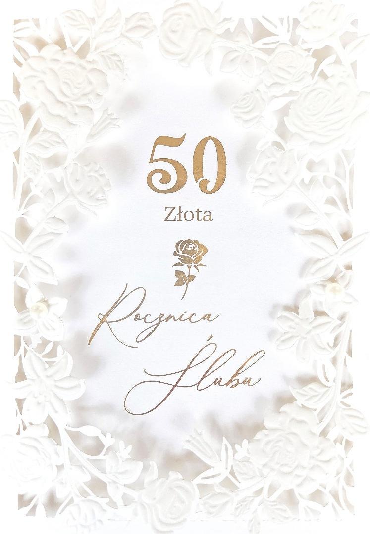 Elegancki karnet na Ślubny w formacie B6 z laserowo wycinanym wzorem. Delikatny, ażurowy motyw z symbolami ślubnymi. Wewnątrz miejsce na życzenia. Idealna pamiątka tego ważnego dnia.