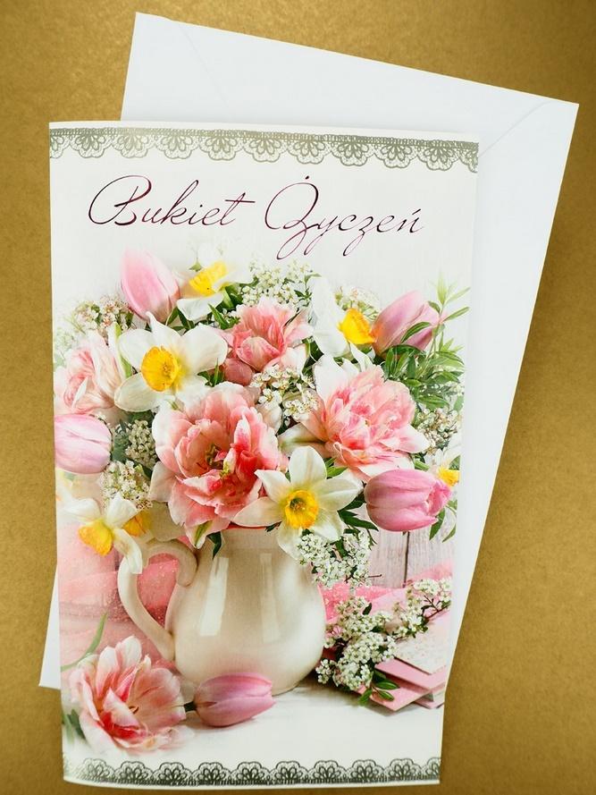 Karnet z życzeniami i kopertą, posiada ozdobne wytłoczenia, które błyszczą się w świetle. Wewnątrz karnetu kolorowy środek i wyjątkowe życzenia.