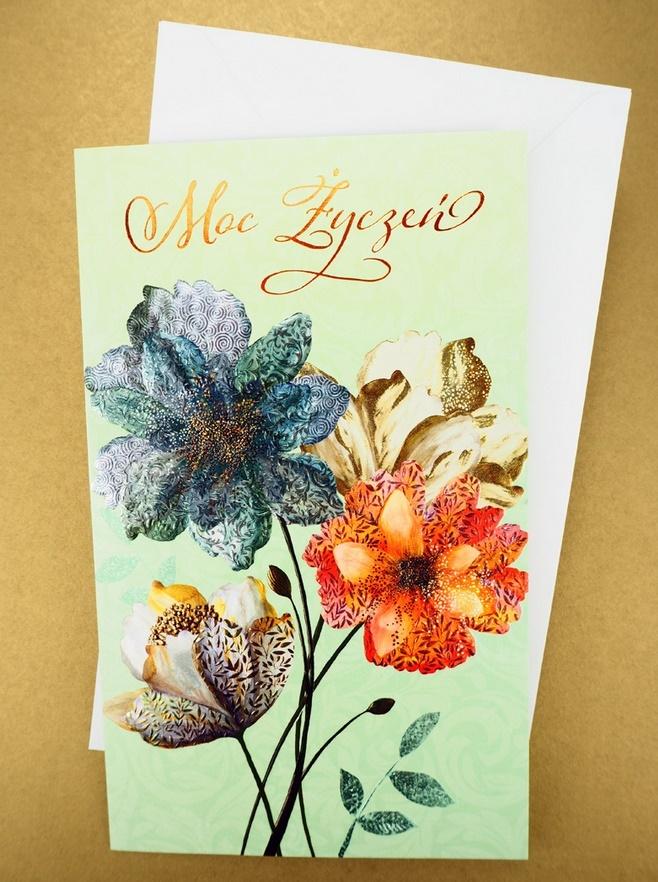 Karnet z życzeniami i kopertą, posiada ozdobne wytłoczenia, które błyszczą się w świetle. Wewnątrz karnetu kolorowy środek i wyjątkowe życzenia.