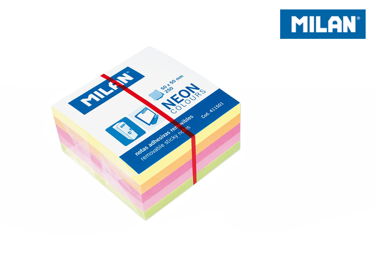 Kostka mini karteczek samoprzylepnych w 4 neonowych kolorach. Wymiary: 50 x 50 mm, 250 szt.