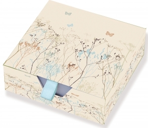 Zdobione 250 karteczek do zapisków, pakowane w eleganckie pudełko z wstążką, zamykane na magnes. Karteczka o wymiarze 10x10 cm.