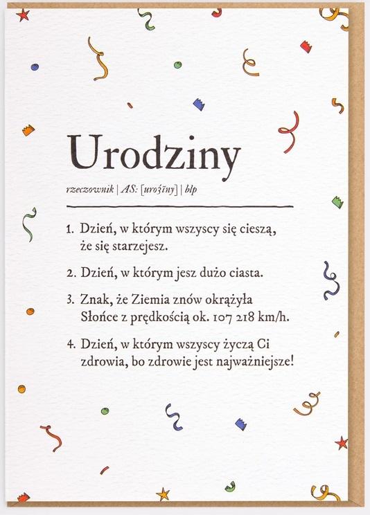 Kartka urodzinowa DEFINICJA URODZIN poleca się jako oryginalny dodatek do prezentu dla każdego solenizanta, niezależnie od metryki. Nic dwa razy się nie zdarza: drugiej takiej nie znajdziesz!