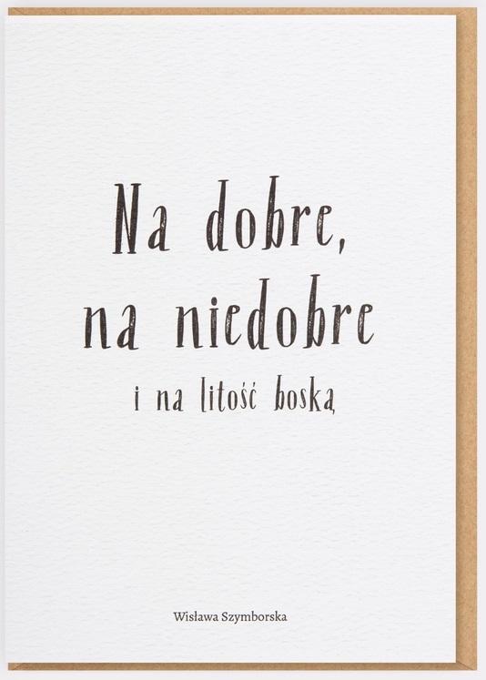 NA DOBRE, NA NIEDOBRE I NA LITOŚĆ BOSKĄ to kartka okolicznościowa inspirowana jednym z najbardziej znanych, a zarazem najpiękniejszych wierszy Wisławy Szymborskiej. Uniwersalny, minimalistyczny wzór sprawdzi się jako dodatek do prezentu ślubnego, kartka z okazji jubileuszu ślubu i walentynka. Doceni ją każdy miłośnik literatury polskiej, zwłaszcza poezji noblistki!