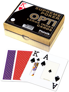 Najwyższej jakości karty do pokera renomowanej firmy Ferd. Piatnik & Sohne. Na awersach powiększone indeksy. Do rozgrywek, w których potrzebna jest lepsza widoczność oraz dla osób słabiej widzących. W złoconym pudełku 2 talie, składające się z 55 plastikowanych kart o pokerowym wymiarze 63 x 88 mm i gramaturze 310. Wyroby wiedeńskiej fabryki Ferd. Piatnik & Sohne od 1824 roku urzekają bogactwem wzorów i perfekcją wykonania. Jakość i tradycja!