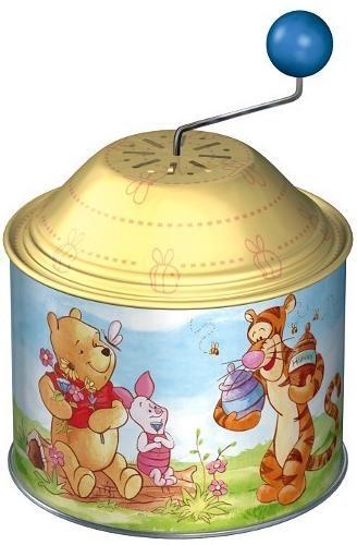 Metalowa pozytywka z pokrętłem ozdobiona motywami z kreskówki Kubuś Puchatek.