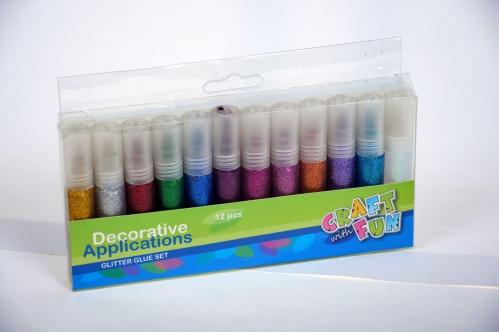 Zestaw brokatowych klejów do ozdabiania. Możesz wykorzystać go upiększając kartki, kubki, figurki, a także jako niezwykły dodatek do innych prac plastycznych. W zestawie 12 kolorów klejów.
