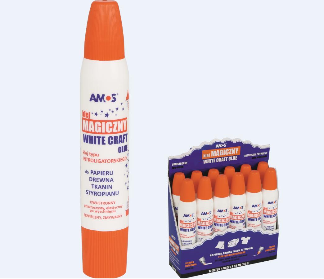 Wysokiej jakości klej w płynie, zmywalny , elastyczny po wyschnięciu , nie kruszy się , przeznaczony do papieru , drewna i tkanin , dwie końcówki: szeroka do dużych powierzchni i wąska do precyzyjnego dozowania , zgodny z normą CE.