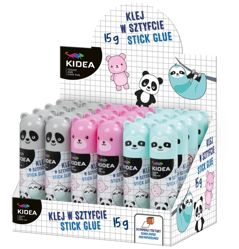 Tradycyjny, szkolny klej w sztyfcie w nowej odsłonie. Urocze zwierzątka na zatyczkach - panda, miś i leniwiec. Klej wysokiej jakości - szybko schnie i mocno trzyma klejone powierzchnie.
