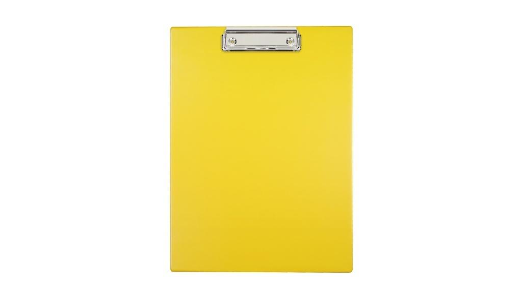 folia PVC kolorowa, środek usztywniony tekturą, sprężysty mechanizm zaciskowy służący do utrzymania kartek papieru, format A3, A4, A5 i A6; na zamówienie deska z klipem na dłuższym boku, występuje w 10 kolorach.