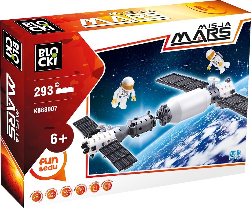 Komplet klocków umożliwiający zbudowanie modelu stacji kosmicznej. W zestawie 2 figurki astronautów