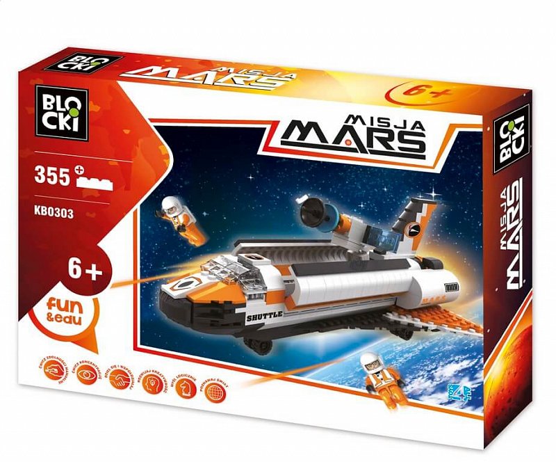Zestaw plastikowych klocków umożliwiających zbudowanie modelu promu kosmicznego.