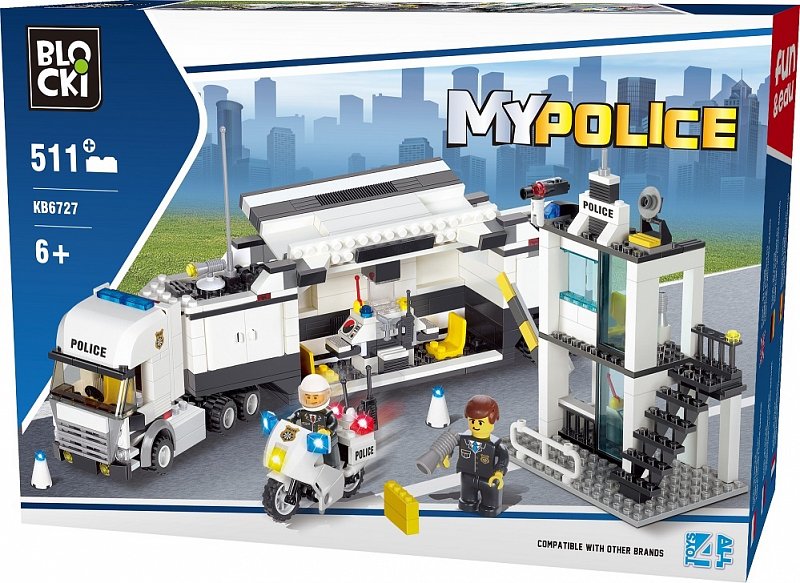 Zestaw 511 klocków umożliwiający zbudowanie mobilnego centrum dowodzenia Policji z motocyklem i posterunku ze szlabanem.