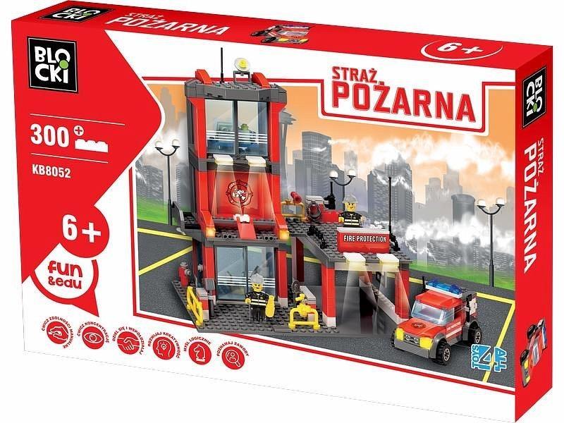Zestaw klocków do budowy małej remizy Straży pożarnej z samochodem terenowym.