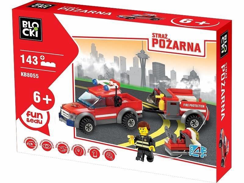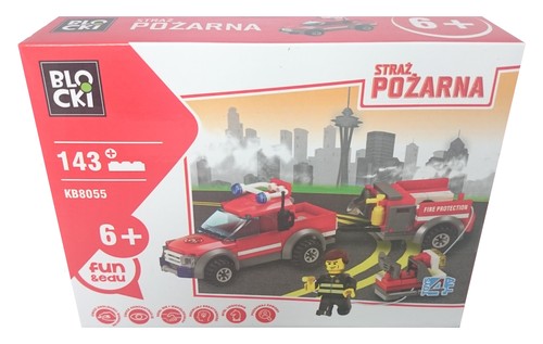 Zestaw klocków umożliwiający zbudowanie samochodu straży pożarnej z przyczepą.