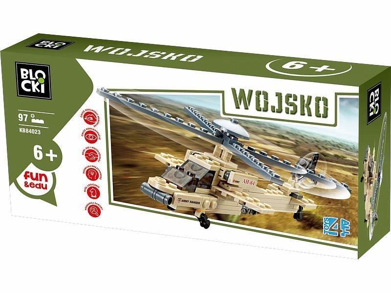 Zestaw klocków do budowy modelu śmigłowca szturmowego.