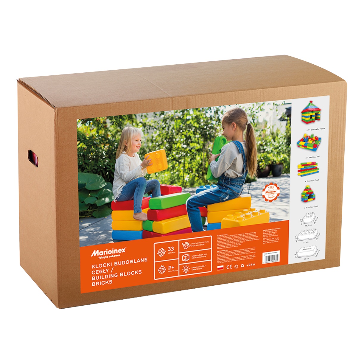 Zestaw zawiera 33 gigantyczne klocki w 3 kształtach, które dają małym budowniczym niezwykle dużo radości, a przy tym rozwijają kreatywność, wyobraźnię przestrzenną, koordynację wzrokowo-ruchową, uczą logicznego myślenia i wspierają pracę zespołową