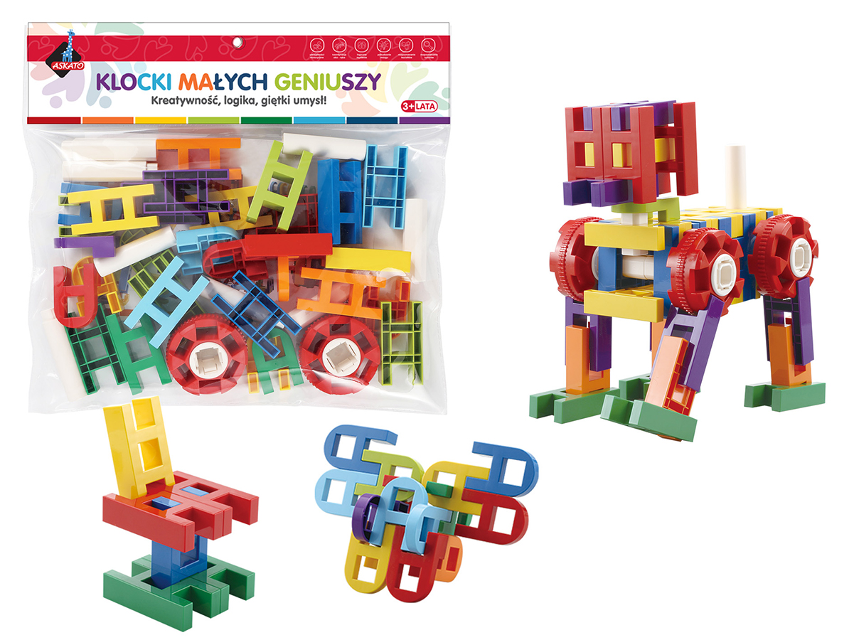 40 elementy w różnych kolorach pozwala stworzyć fantastyczne, przestrzenne figury, zaczynając od tych prostych takich jak krzesło poprzez nieco trudniejszego psa lub helikopter.