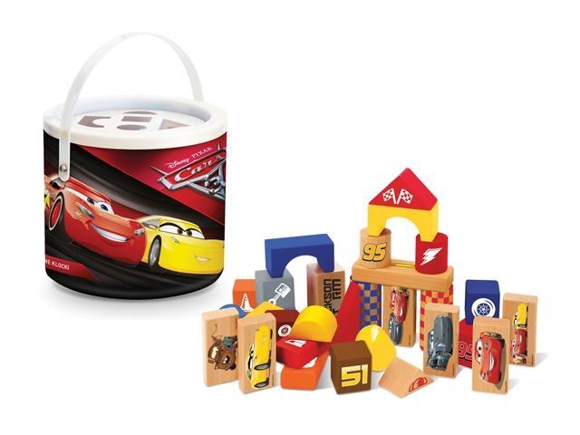 Zestaw drewnianych klocków zamknięty w wiaderku, które pomaga w przechowywaniu i przenoszeniu zabawek.