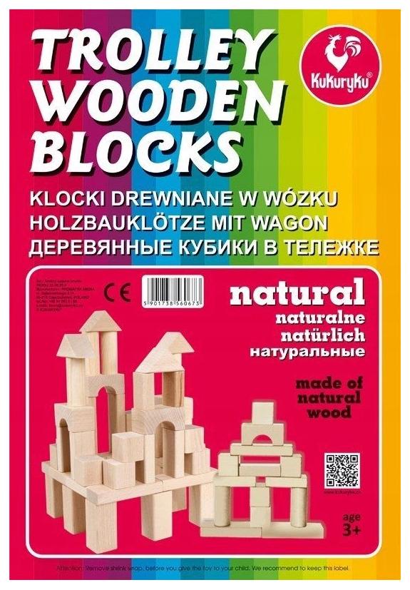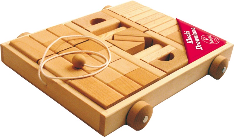 Zestaw 37 ekologicznych klocków w kolorze naturalnego drewna zapakowanych w wózeczku, który może pełnić funkcję zabawki i pojemnika do przechowywania klocków.