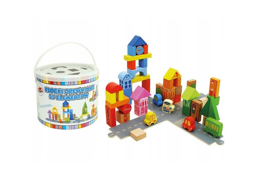 Zestaw kolorowych drewnianych klocków dla najmłodszych do zabawy w miasto.