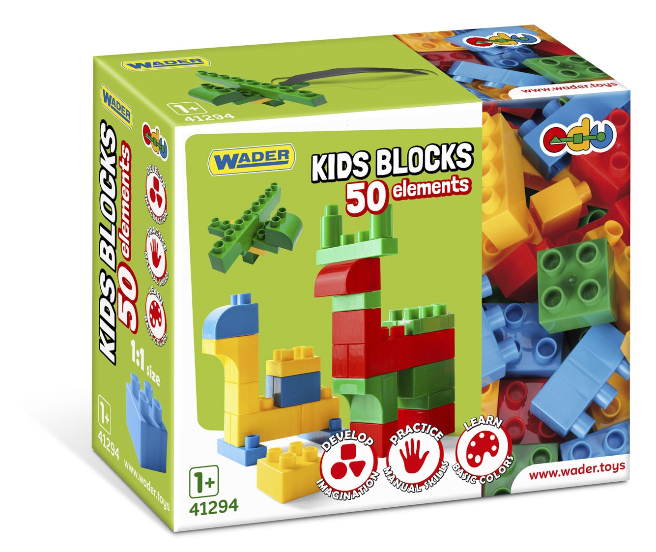 Prezentowany zestaw - Klocki Kids Blocks, 50 elementów - przeznaczony jest dla dzieci powyżej 1 roku życia. Zestaw zapakowany jest w atrakcyjne pudełko dzięki któremu łatwiej będzie utrzymać porządek w dziecięcym pokoju, a uchwyt ułatwi ich przenoszenie.