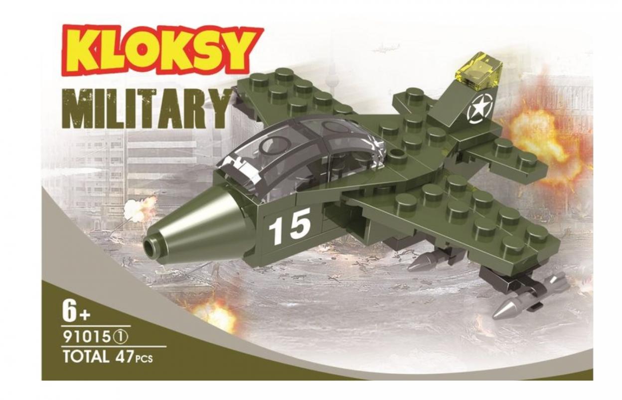 Klocki KLOKSY - Seria armia - samolot, 57 elementów. Zestaw pakowany w display 12 szt. wraz z innymi rodzajami pojazdów wojskowych.
