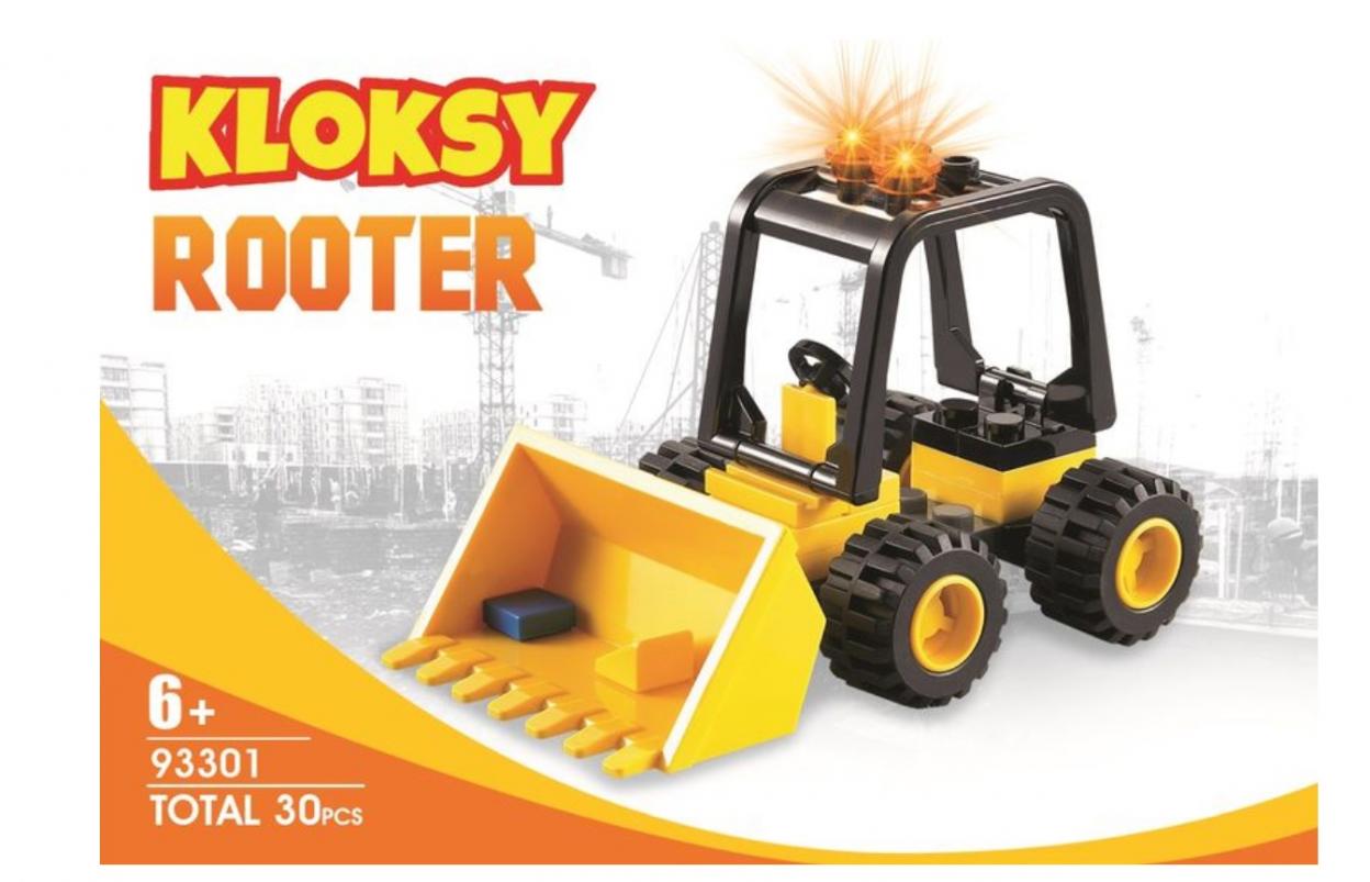 Klocki KLOKSY - Maszyny budowlane - ładowarka, 40 elementów. Zestaw pakowany w display 12 szt. wraz z innymi rodzajami maszyn budowlanych (6 rodzajów po dwie sztuki).