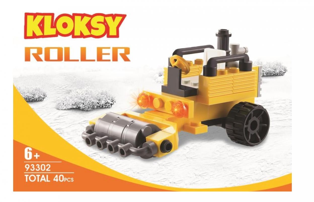 Klocki KLOKSY - Maszyny budowlane - ubijarka, 50 elementów. Zestaw pakowany w display 12 szt. wraz z innymi rodzajami maszyn budowlanych (6 rodzajów po dwie sztuki).