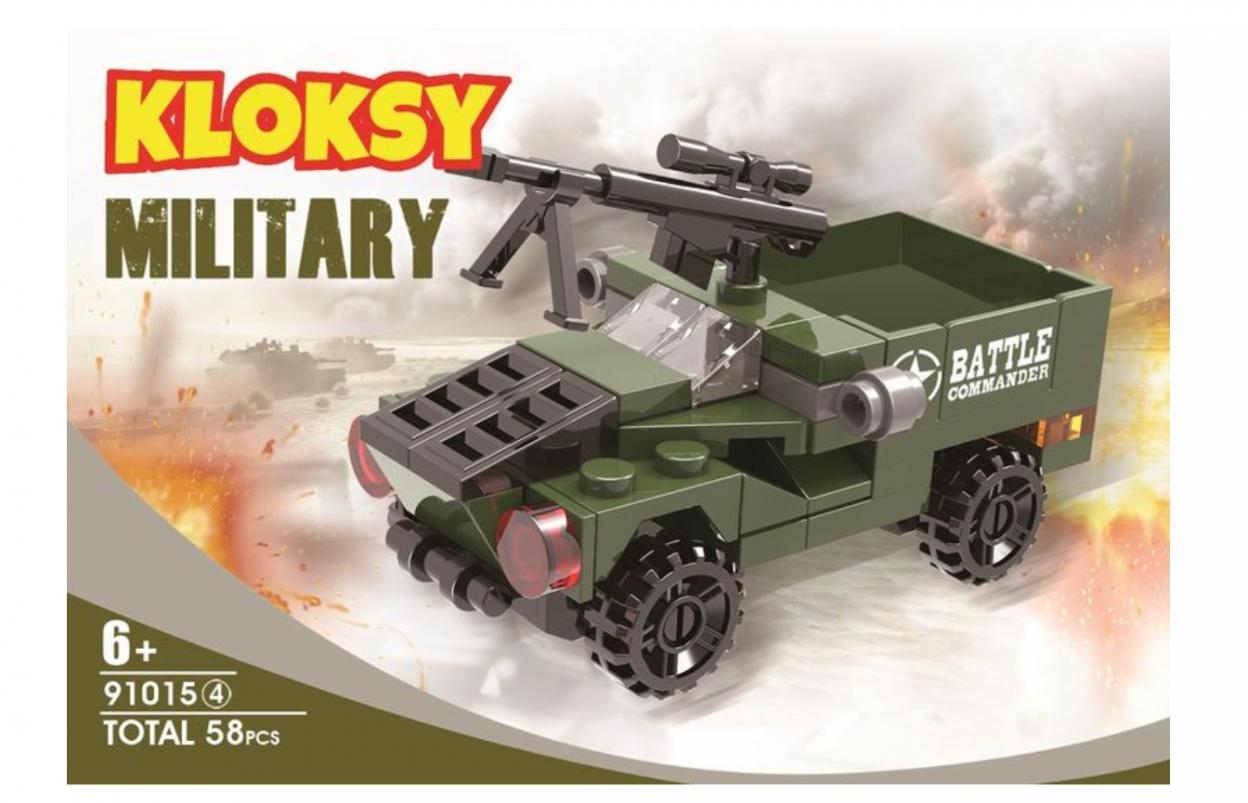 Klocki KLOKSY - Seria policja - wóz bojowy, 68 elementów. Zestaw pakowany w display 12 szt. wraz z innymi rodzajami pojazdów wojskowych.