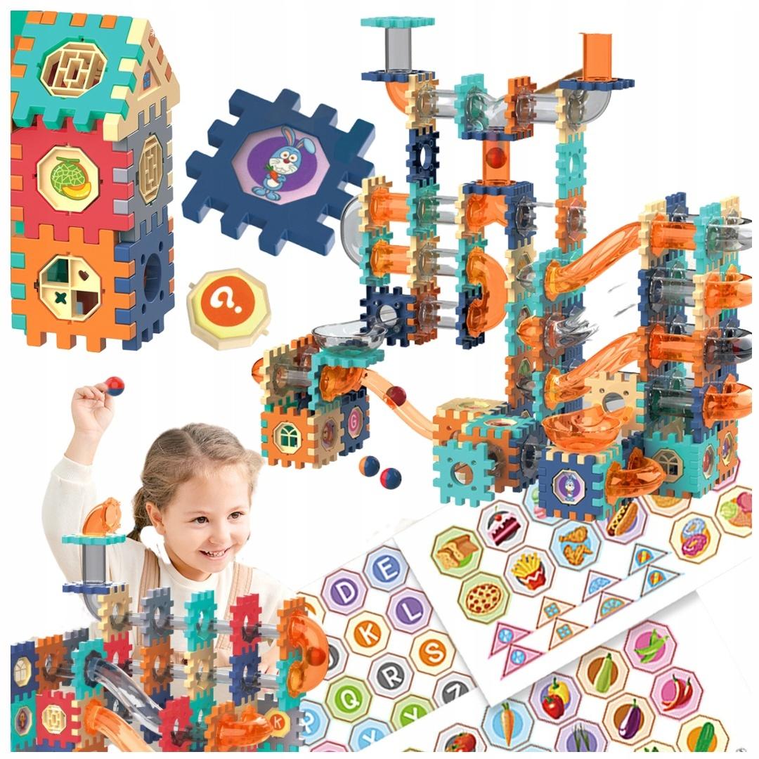 Zestaw składa się z różnokolorowych klocków, które można łączyć i tworzyć różnorodne konstrukcje. Dzięki połączeniom, klocki trzymają się ze sobą mocno i stabilnie, dając możliwość budowania zarówno prostych struktur, jak i bardziej zaawansowanych konstrukcji. Tor można układać w różne kształty i trasy, co dodatkowo rozwija wyobraźnię i zdolności konstrukcyjne dziecka.