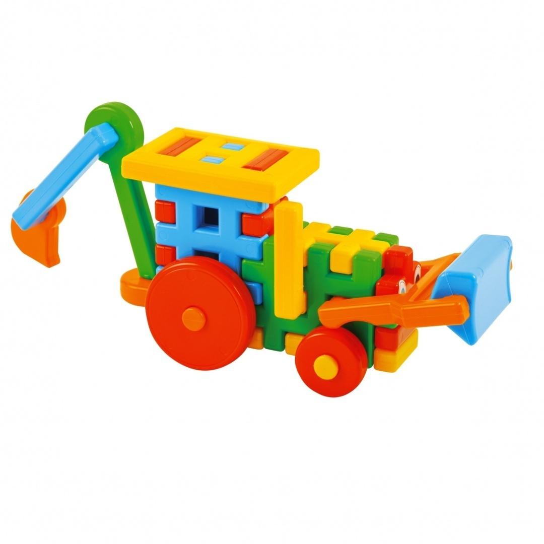 Model koparki wykonanej z klocków konstrukcyjnych. Koparka charakteryzuje bogactwem kolorów. Elementy z klocków konstrukcyjnych pasują do innych zestawów.